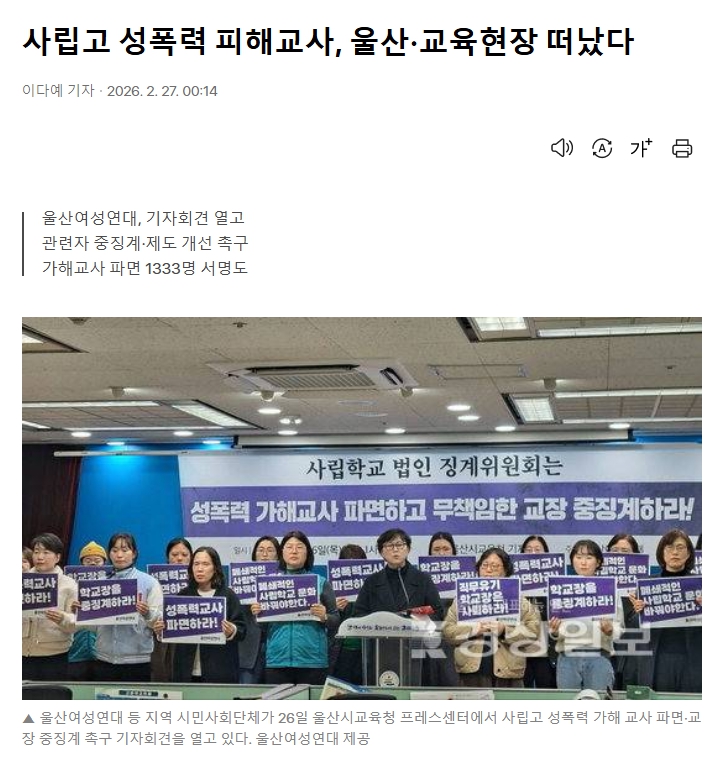 ¿ï»ê ÇÑ »ç¸³°íµîÇб³ ¼ºÆø·Â ÀÇȤ °ü·ÃÀÚ¿¡ ´ëÇÑ Â¡°è ÀýÂ÷°¡ Áö¿¬(º»º¸ 2¿ù26ÀÏÀÚ 5¸é)µÇ´Â »çÀÌ, ÇÇÇØ ±³»çµéÀº ±³À° ÇöÀå°ú ¿ï»êÀ» ¶°³ °ÍÀ¸·Î ÆÄ¾ÇµÆ´Ù. ÇÇÇØ ±³»ç¿Í Áö¿ª ½Ã¹Î»çȸ´Üü´Â °¡Çر³»ç¡¤Çб³Àå¿¡ ´ëÇÑ Áß¡°è µîÀ» Ã˱¸ÇÏ°í ³ª¼¹´Ù.